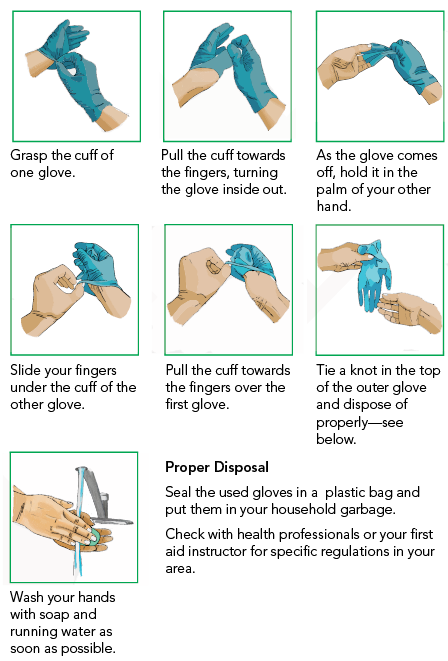If you tear a glove, wash your hands as soon as possible, and put on a new pair. Dispose of contaminated gloves by sealing them in a plastic bag and double bagging them.