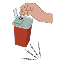 Needles should be disposed of in a “sharps container.” These plastic containers have thick walls and a secured lid that prevent accidental punctures. Ambulances will carry sharps containers and any needles found or used during an emergency can be placed in these containers. Always handle needles by the barrel (the plastic part with the plunger) and never try to re-cap a used needle.