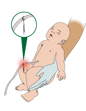 - Clamp the cord (or tie with heavy string) 6 and 12 inches from the baby’s body.