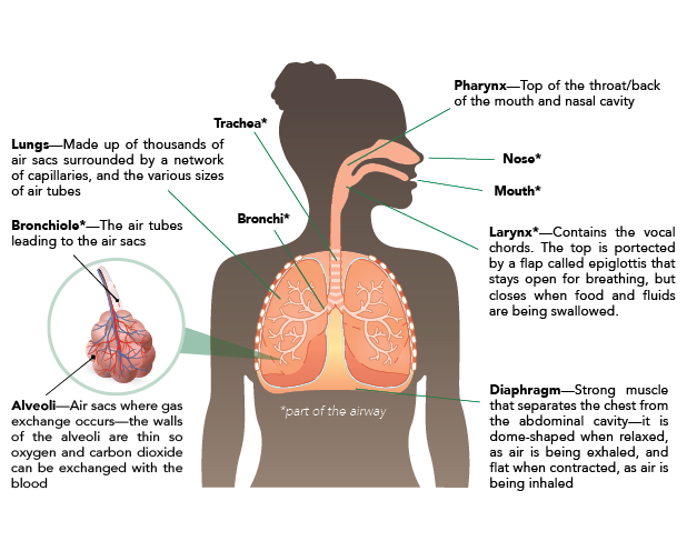 The respiratory system has three main parts: the airway, the lungs and the diaphragm. The airway is the passage that air follows to get from the nose and mouth to the lungs. In the lungs, blood drops off carbon dioxide and picks up oxygen. This process is called gas exchange. The diaphragm, a smooth, flat muscle just below the lungs, is used in breathing.