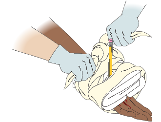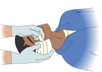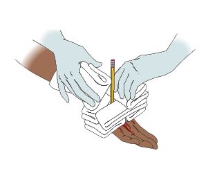 - Secure the bulky material (dressings) in place with a narrow bandage, taking care not to exert pressure on the embedded object.